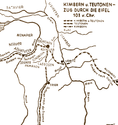 Der Verfasser veröffentlichte als neue Forschungen zur Vor- und Frühgeschichte der Eifel mehrmals Abhandlungen über die Aduatucafrage und besonders über die Frage Wo lag das Castell Aduatuca? (Cäsar Gall. Krieg Buch II, 29 ff. und Buch V, 24 ff. und VI, 31.) Er deutet diese Fliehburg mitten im Lande der Eburonen als das Ad Vatucam des Codex v. Parisiensis, d. h. die Gutswache der Kimbern und Teutonen in den Jahren 102/103 v. Chr. zwischen Maas und Rhein. Dieses Aduatuca ist der Ursprungsort und in diesem Sinne der Vorort der Aduatucer, die hier als Gutswächter für die Beute ihres Völkerzuges ihren Anfang als selbständiger Volksstamm hatten. Im Jahre 113 v. Chr. begann jene große uns durch die antiken Schriftsteller bekannt gewordene große germanische Völkerwanderung, die wir Kimbern- und Teutonenzug nennen. Vom Cimbrorum Promuntorium, wie Plinius 3 sagt, d. h. von Jütland und Schleswig-Holstein aus zogen, durch Springfluten, Klimasturz oder Landnot gezwungen, mehrere germanische Stämme nach Süden, überschritten, vielleicht bei Urfahr in der Nähe von Wien, die Donau, kamen durch Kroatien, Slavonien und Steiermark nach Kärnten, vernichteten im Lande der Noriker (bei Noreja = Neumarkt) das ihnen entgegengeschickte römische Heer, zogen aber nicht nach Italien hinab, sondern immer am Nordrande der Alpen entlang westlich durch Oberbayern, Württemberg und Südbaden. Dann überschritten sie den Rhein, rissen die Helvetier mit sich fort, durchquerten den Schweizer Jura und das Land der Sequaner und kamen dann in die römische Provinz Gallia Narbonensis, d. h. die Provence. Der römische Schriftsteller Livius berichtet uns, daß sie dort wiederum ein römisches Heer vernichteten, vier Jahre in Südgallien blieben und im Jahre 105 in zwei großen Schlachten - eine bei Arausio-Orange - abermals die Römer besiegten. Nach Norden zurück Wiederum lag der Weg nach Italien offen vor ihnen. Sie trennten sich aber in zwei Heerhaufen: die Kimbern zogen über die Pyrenäen nach Spanien und kamen bis zum Ebro, die Teutonen trieben sich mehrere Jahre in Südgallien umher. Im Jahre 104 etwa vereinigten sich die beiden Hauptstämme, die Kimbern und die Teutonen wieder mit den anderen und zogen dann gemeinsam nach Osten zu, gegen das Land der Belgier (Bell. gall. II 4). Dort traten ihnen die Nervier, der tapferste der belgischen Stämme, wie Cäsar schreibt, mit Erfolg entgegen, und zwar als die einzigen aller belgischen Stämme und wehrten sie von ihrem Lande ab. (siehe Karte I.)