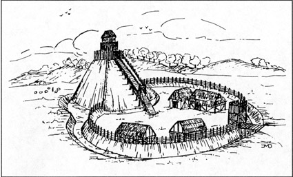 Weiter heißt es: Die Festen Häuser dagegen finden wir eher in Gebieten mit einer hohen Kultur und einer geordneten und stabilen gesellschaftlichen Struktur. Ab der zweiten Hälfte des 10. Jahrhunderts gab es die ersten schüchternen Ansätze, die traditionellen, horizontalen Wehranlagen durch Motten zu ersetzen, einem neuen Festungstyp mit einem einzigen starken, dominanten Punkt. Den Kern der Motte bildete ein konischer Hügel, der entweder bereits vorhanden war (wie in Komont) oder künstlich aufgeschüttet wurde (Kessenich, Millen, Horpmaal, Brustem). Der Querschnitt eines solchen Hügels variierte zwischen zwanzig und hundert Metern und die Höhe zwischen drei und zwanzig Metern. An seinem Fuß war der Hügel von einem Ringwall mit Graben umgeben. Oben auf dem Hügel befand sich ein viereckiger Holzturm. Dieser Turm war für den Herrn sowohl Wohnung wie Bastion und Asguck. Meistens befand sich am Fuß des Hügels eine zweite niedrigere Geländeerhöhung mit den Wirtschaftsanlagen (Bauernhof, Stallungen) und der Kapelle. Dieses Zwinger genannte Areal war ebenfalls von einem Palisadenzaun und einen Graben umwehrt. Innerhalb dieser äußeren Veteidigungslinie gab es auch Räume für die Garnison und Platz für Menschen aus der Umgebung, die aus irgendwelchen Gründen ein Unterkommen suchten ...] 2)
